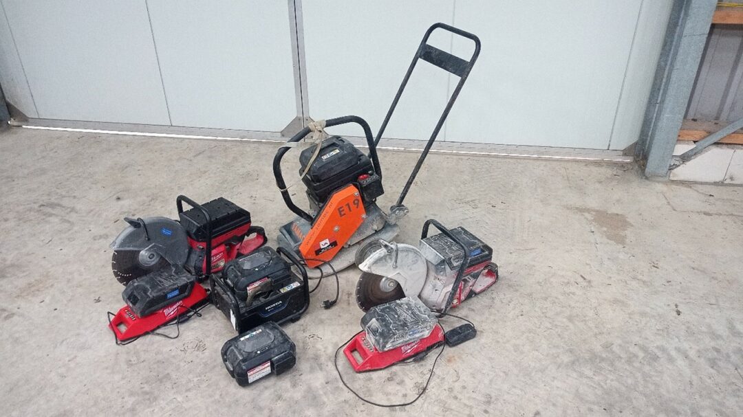 Op de foto zijn twee Milwaukee MXF-COS350-602 accu-bandenzagen te zien. Deze zagen zijn speciaal ontworpen om gewapend beton door te zagen en kunnen bladen met een maximale diameter van 350 mm aan. Elke zaag heeft een zaagdiepte van 12,5 cm en beschikt over 2 accu’s. Daarnaast is er een elektrische trilplaat van Samac, model T19E. Deze trilplaat heeft