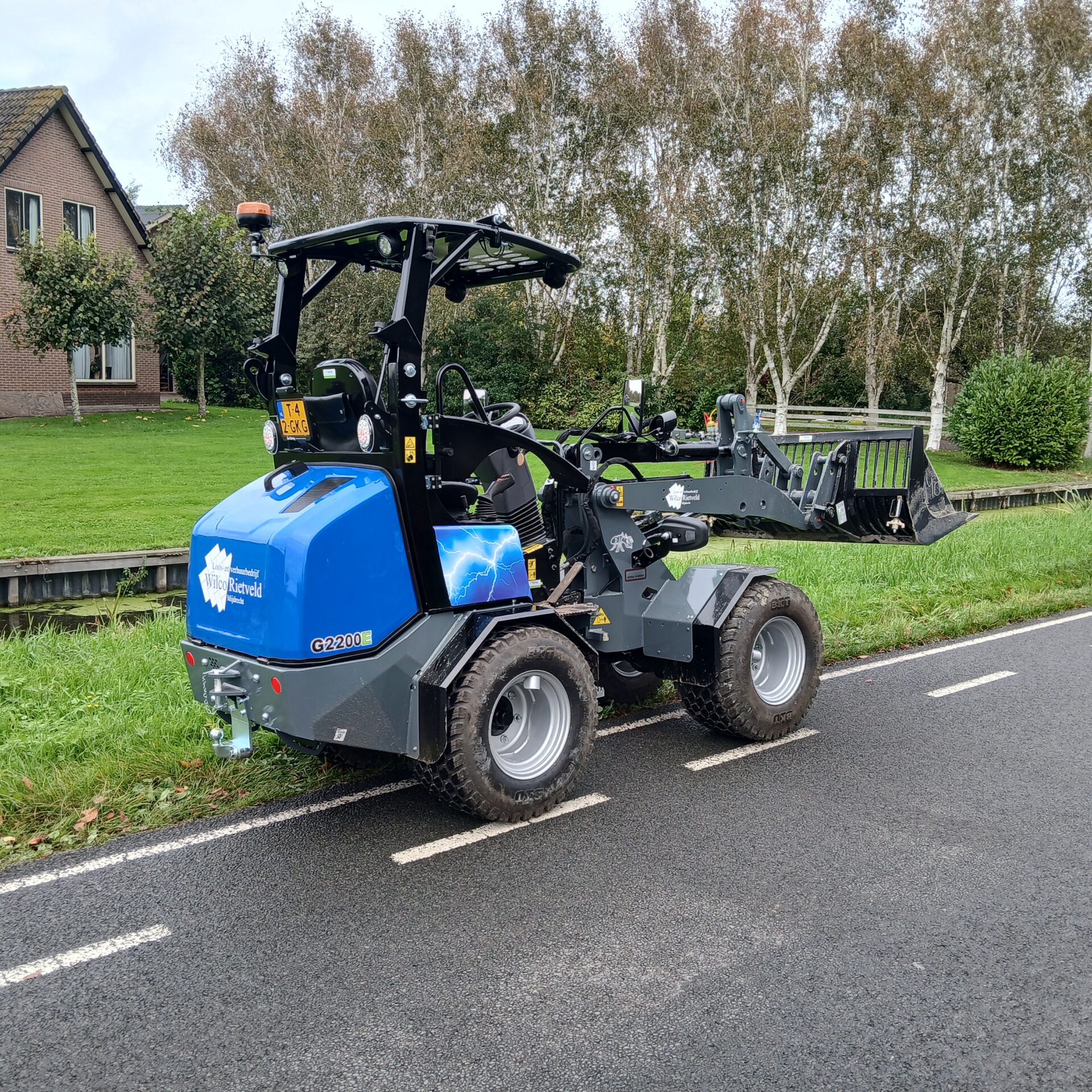 Deze Giant g2200e extra shovel wordt veel gebruikt waar emissievrij gewerkt moet worden. Deze machine heeft een hef capaciteit van 2ton, genoeg om een groot pak stenen te verplaatsen. Door het lage eigen gewicht van 2200 kilo en brede gazonbanden ontstaat er minimaal schade aan de zandbaan of het straatwerk. Door het omlaag te klappen dak en met een breedte van 1.35m past hij makkelijk in een parkeergarage. Kortom de ideale kleine machine voor het grote werk.